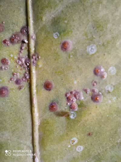المشكله تبدء في الصيف قبل قطف الثمار حوالى شهرين تبدء أسفل الورقة مادة ثانيه بيضاء عليها مادة صمغية ثم تنقلب إلى الون الاسود وتؤثر على شكل الثمار بالون الاسود