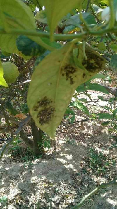 المشكله تبدء في الصيف قبل قطف الثمار حوالى شهرين تبدء أسفل الورقة مادة ثانيه بيضاء عليها مادة صمغية ثم تنقلب إلى الون الاسود وتؤثر على شكل الثمار بالون الاسود