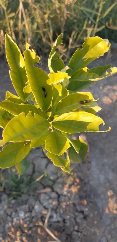 السلام عليكم اخي الكريم ابو فدك المسعودي اؤيد ما ذكرته الاخت المهندسة Samira Ghouil سميرة غويل وفقها الله لكل خير اخي الغالي لديك نقص في التربة من عنصرالحديد ممكن استخدام سماد الحديد المخلبي كل 15 يوم بمقدار 75غرام اي ملعقة طعام كبيرة حول النبات اما الحشرة فهي يرقات دودة الحمضيات ممكن رفعها من على النبات يدويا دون الحاجة لمبيد ومخاطره واذا كان هنالك اكثر من نبته ممكن استخدام اي مبيد حشري يعمل بالملامسه لقتلها كالفلاش متوفر بالاسواق جذور النبات ايضا بحاجة الى تهوية فالارض طينية ثقيلة يمكنك مزج بعض السماد العضوي المتحلل بشرط يكون متحلل حول جذور النبته لتحسين التهويه لها