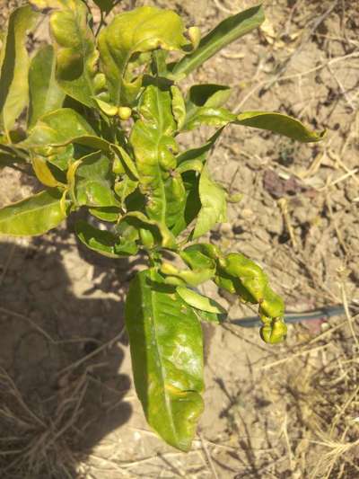 السلام عليكم محمد البدر هل توقف نموها؟، ربما هي اعراض فيروس ،اضغط على الرابط التالي لتقارن الأعراض : مرض تقزم واصفرار الموالح الفيروسي عليك بصنع سياح من قصب لتحميها من الرياح و الحرارة، سمدها واعتني بها