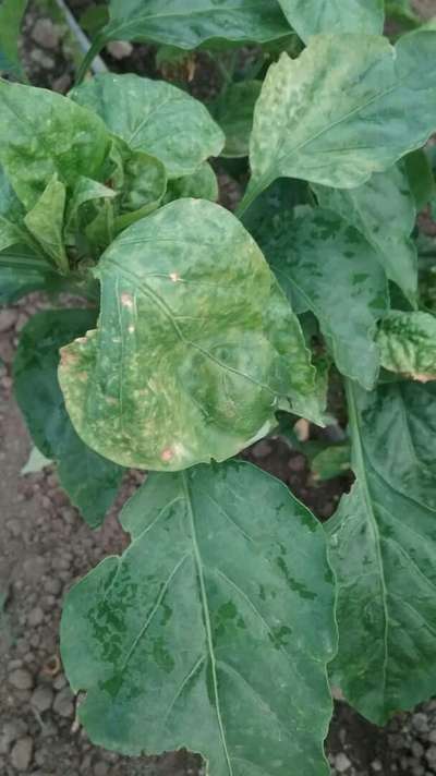 هذا بازنجان عمر كبير وتظهر الاصابه عباره عن اصفرار القمه الناميه مع ظهور بقع بنيه ضغيره علي الاوراق