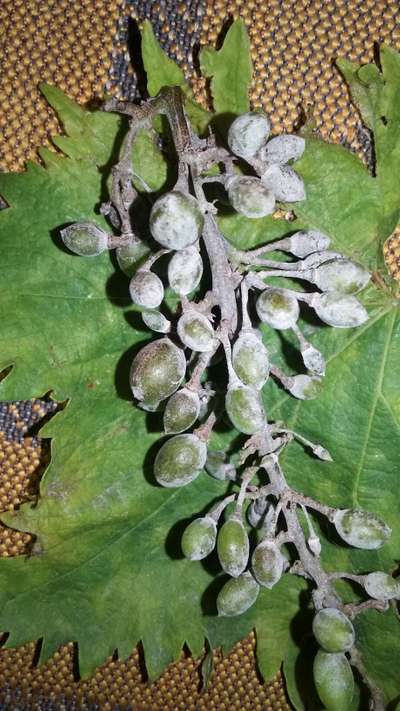 انتهاء عنقود العنب بالحريق واليبس ويتحول لون العنقود الى الاسود اوجهه هذه المشكله سنويا وفي كل عام ينتهي اغلب المحصول.
