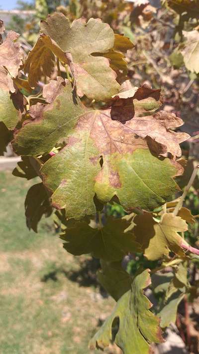 ظهور اوراق العنب بهذا الشكل مع وجود نوع من الحشرات صغيرة الحجم (هسهس صغير ) لونها ابيض تلاحظها عند تحريك اغصان الشجرة بكثافة