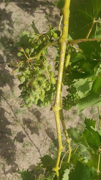 السلام عليكم علي قامس اعتقد انها إصابة باثركنوز العنب ،أصغط على الرابط التالي ستجد عدة معلومات : انثراكنوز العنب
