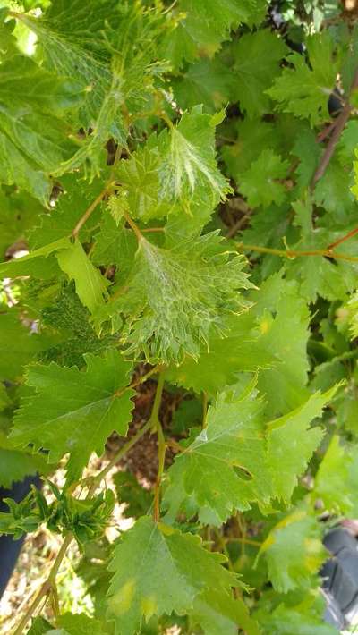 عندي شتلة عنب قمت بزراعتها على طرف الحقل، وفي بداية موسم الربيع بدأت أوراقها تظهر بهذا الشكل، ما السبب، بعدها قمت بالتخلص من كل الاوراق التي بهذا الشكل ونمت أوراق صحية. ما هو سبب هذا التشوه الغريب