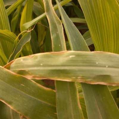 هذه نبتة للذرة.. زراعة بالحوض.. مالمشكلة هل هي فطري مع إني وضعت مبيد فطري بكتيري عليها قبل شهر والآن ظهرت عليها هالأعراض.. فما السبب؟؟ وما الحل؟؟