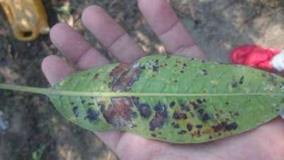 يظهر قطرات من الزيت الاسود على السطح العلوى الورقه و يتساقط هذا الزيت على أفرع الشجر و على الثمار و هناك بقع بيضاء على السطح السفلى الورقه . كما موضح بالصور.