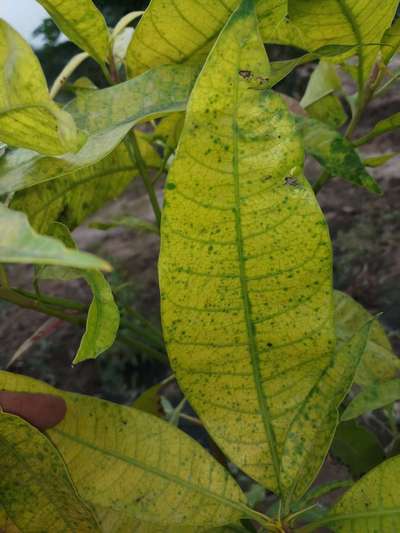 تغيرفي لون اوراق وساق شجره المانجو من اللون الاخضر الى اللون الاصفر انظر الشكل واللون