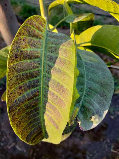 أعفان تكونت بسبب إفرازت حشرية الشجرة صغيرة والأفضل أن تقوم بتنظيف الأوراق بيديك وغسلها بالماء والصابون لأن هذه المادة تحجب CO2 عن الدخول