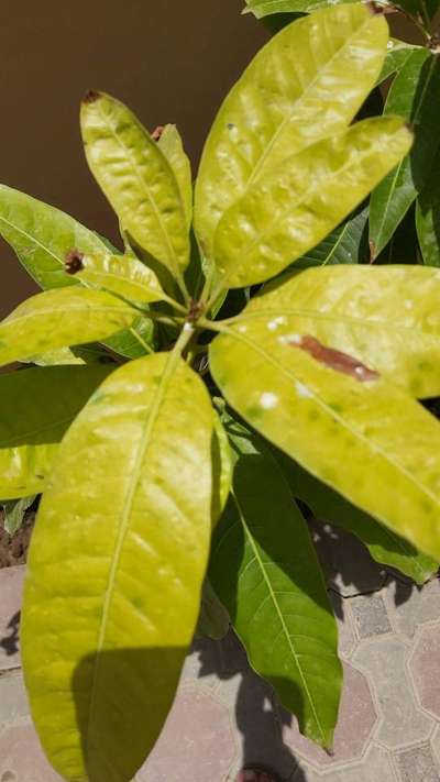 اصفرار الاوراق واحتراق النموات الجديدة وتوقفها عن النمو في شجرة المانجو كما في الصورة؟؟؟؟