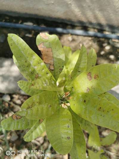 اصفرار الاوراق واحتراق النموات الجديدة وتوقفها عن النمو في شجرة المانجو كما في الصورة؟؟؟؟
