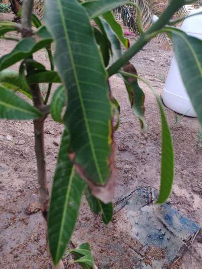 تحول لون اوراق المانجو إلى اللون الأصفر ثم اللون البني الغامق مع الالتواء في الورقة حتى تصل إلى الذبول ومن ثم السقوط