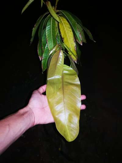 لاحظت اليوم ورق شجرة المانجو الوحيدة التي لدي خروج ورقة كبيرة جدأ غير مألوف لي ماهو السبب؟ الطول شبر ونص... 15 سنتي تقريبا!