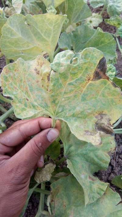اذا كنت تريد زيادة في المحصول أضف سماد ( الداب ) وهو نيتروجين و فسفور النيتروجين لزيادة فروع حديثة والفسفور لزيادة الزهور وتقوية الجذور اما الاوارق المصابة قصها بعد خروج البراعم الحديثة لان عليها فطريات وحشرات وخاصتا العناكب لقد جربتها في بطيخ اصفر ونجحت