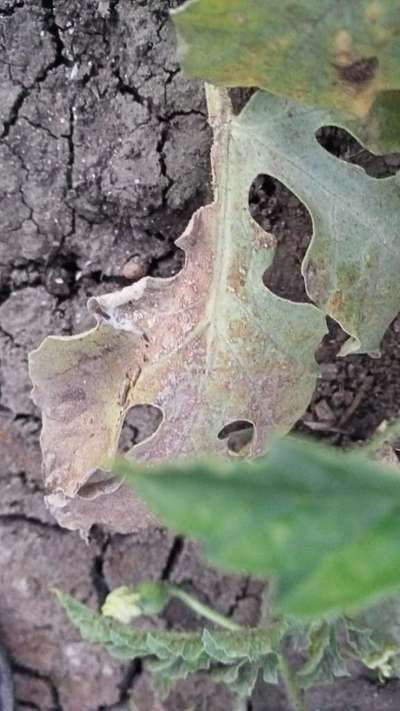 السلام عليكم Ebrahim Giwely اعتقد انها اعراض الملديو ،اضغط على الرابط التالي لو تسمح : Downy Mildew of Cucurbits