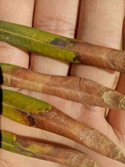 السلام عليكم إصابة عدد كبير نن اوراق الزيتون بهاته الاصابة هل هدا من الصقيع ؟! ام مرض