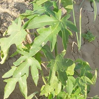 ظهور بقع بيضاء جافه في اوراق البابايا وانتشارها تسبب تيبس الاوراق وتغير لون الاوراق ومن ثم سقوطها علما انه في هذه الفترة بدأت الثمار بالنضج .