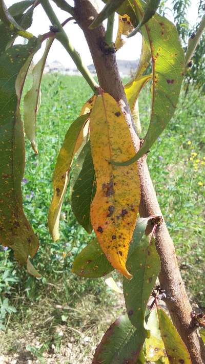 ظهور بقع حمراء على اوراق الخوخ تتكاثر حتى تيبس الاوراق. نرجوا المساعدة. شكرا.