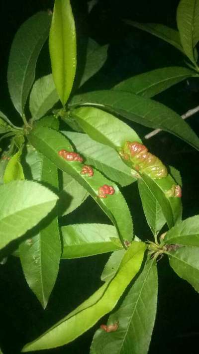 هذه شجرة خوخ او دراق غرستها هذا العام فلما اورقت صارت اوراقها بهذا الشكل ماهذاةالمرض وما علاجها شكرا لكم