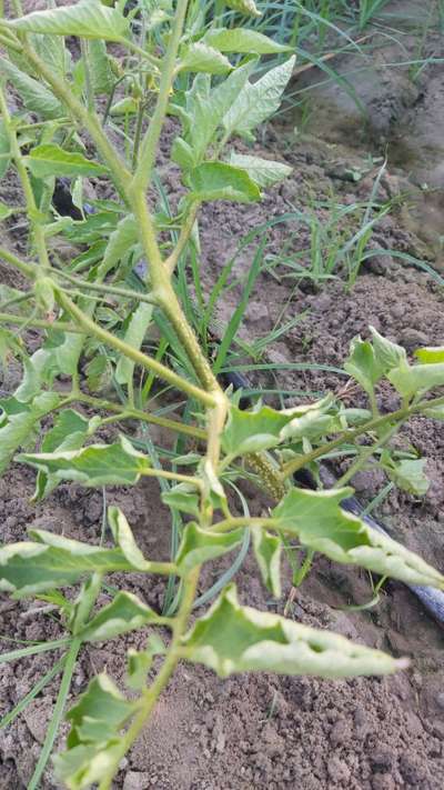 ما تشخيص حضراتكم للاعراض التى تظهر فى الصورة على نبات البندوره (الطماطم) وايه العلاج