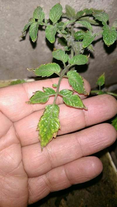 مجرد احتراق الحواف في الاوراق يشير إلى نقص البوتاسيوم ، رش الطماطة بسماد ورقي عالي البوتاس مثل 12-12-36بوتاس .