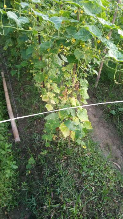 জুনায়েদ আলম আপনার গাছের গোড়ায় এতো আগাছা কেন? এই সব আগাছা খাদ্য উপাদান খেয়ে ফেলে, ফলে আপনার শশা গাছে খাদ্যের অভাব হয়। এটা Magnesium Deficiency, কাজেই Epsom salt প্রয়োগ করুন। সবুজ লিংক এ ক্লিক করলে আরও বিস্তারিত জানতে পারবেন কিভাবে যত্ন নিবেন এবং এ সমস্যা সমাধানের চেষ্টা করবেন।