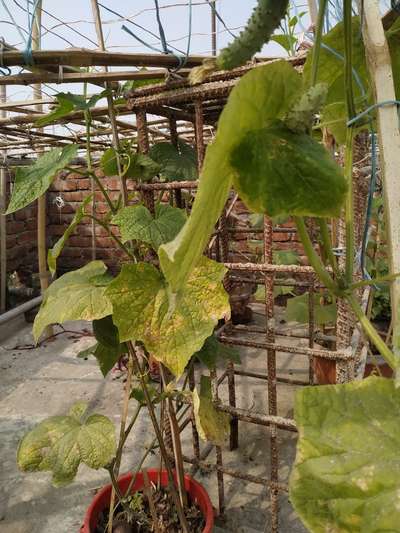 পাতা হলুদ। গাছের বৃদ্ধি কম। কয়েকটি শসা ধরেছে তবে শসার বৃদ্ধি কম।