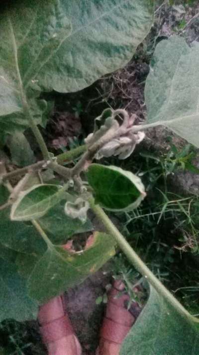 বেগুন গাছের পাতা ছোটো আর কুঁকড়ে jache