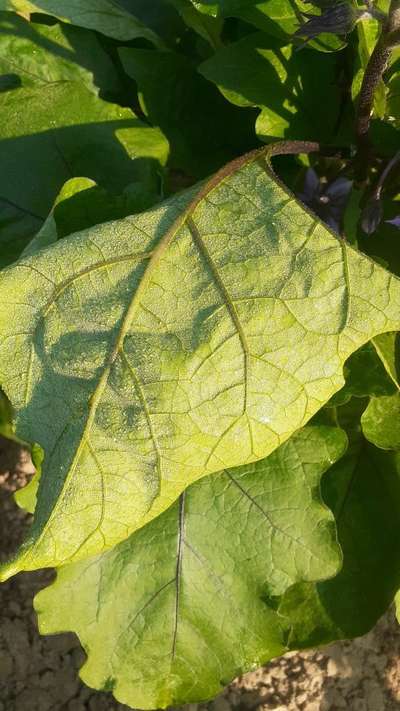 বেগুন গাছের পাতা ছোটো আর কুঁকড়ে jache