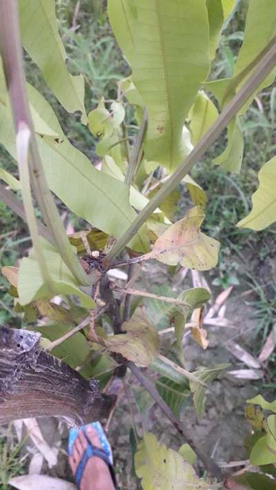 আমের পাতা কুঁকড়ে যাচ্ছে, আমের পাতা সবুজ থেকে হলুদ হয়ে কালো হওয়া শুরু করেছে। আমের জাত হচ্ছে ল্যাংরা।