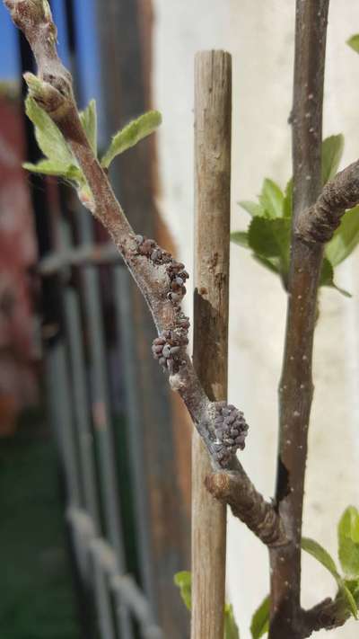Hi, can anyone tell me what this disease is? It's a young dwarf apple, malus braeburn. It looks like white fluffy mould, but when I have just sprayed it (like in the photo) the white fluff disappears and I see small brown lumps in clusters on the stems. They look like tiny insects but don't move at all, and when you squash them they produce a reddish-brown liquid.