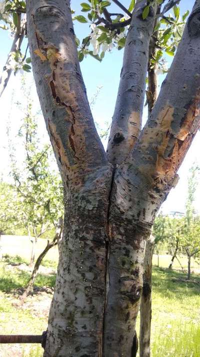 Hi Mohammad Altaf . It looks like Fruit Tree Canker . Click on green link for checking symptoms and taking control measures.