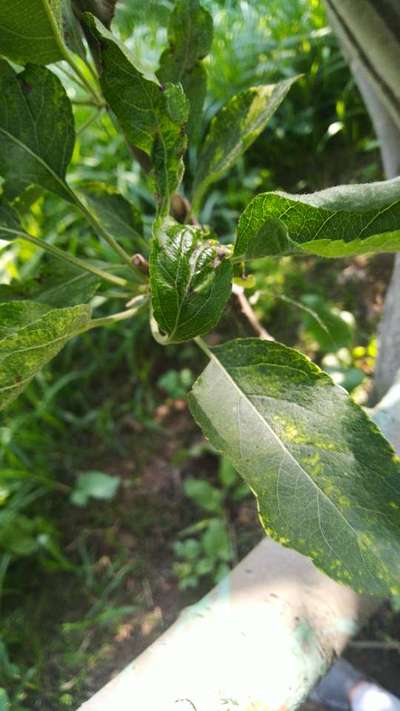 Not sure but Looks like Aphids and initiation of Apple Mosaic Virus . Please have a look in Plantix library for detail information.