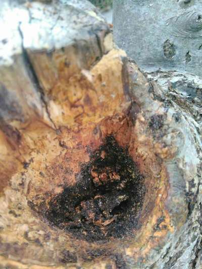 When scraping away dead wood on my apple tree I began to dig into soft moist wood until I ended up creating a hole in the main trunk. What caused this and how can I repair the damage?
