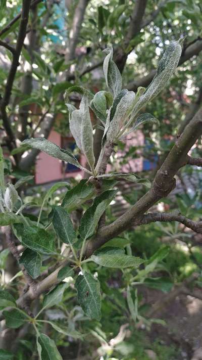 Vinod Dholta Tufail Abbas It is powdery mildew which is found in Himachal. After petal fall I recommend to spray Thiophanate Methyl (Roko) 1gm per litre of water along with some seaweed extract