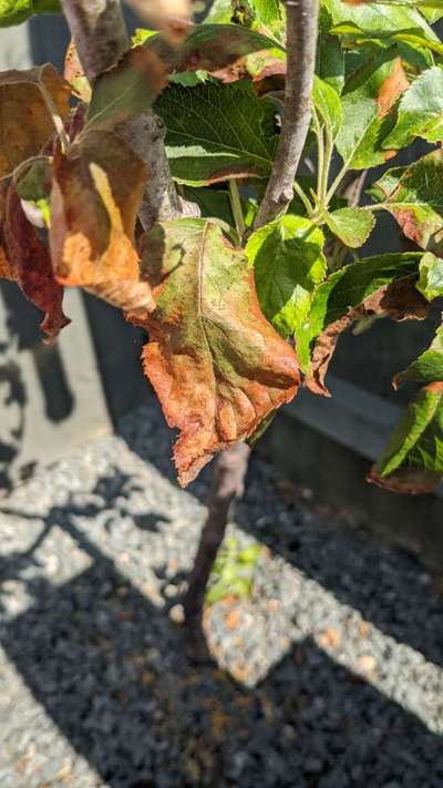 Please could someone help ID the problem with my apple tree? It has leaves that have begun turning brown. It was frosted a week ago though. Planted in a sunny part of the garden and fertilised with potassium but unsure if it has dissolved and the tree is now showing signs of potassium deficiency or something more sinister? Variety is Egermont Russet mini Many thanks for your help!
