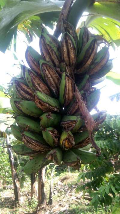 Wow! Wicked! It reminds me of banana Anthracnose. The fruit its splitting and spotted with black. In some points totally dried up, black and crumbly like.