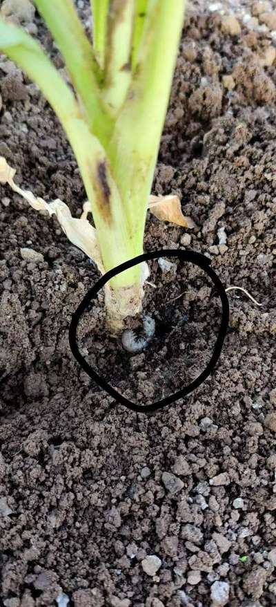 Learn more about PlantixThat Indicated Snell type insect is damaging Banana Crop. It is in the ground from where it is damaging. Whole Banana plant is bending down.