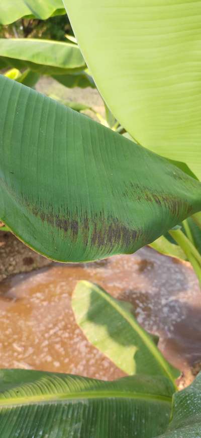 Tha banana leaf losses the chlorophyll and appears stripped black lines in leaf .