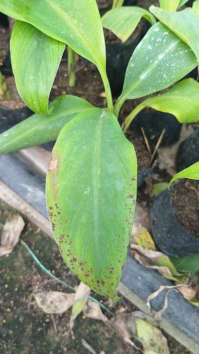 In the secondary hardening banana plants, these spots are visible. Please identify the cause snd suggest the remedy.