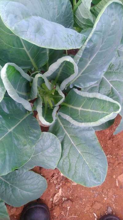 Cauliflower plants of 30 days old, younger leaves are yellowish in color and old leaves shows whiteish patches like burning on tips of the leaves.