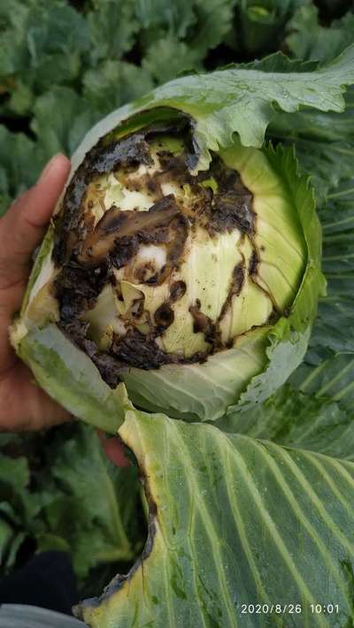 Please detect/diagnose disease carefully.. And tell me its treatment.. Cabbage head/leaves are wrottening.. Our family is so much upset about this..