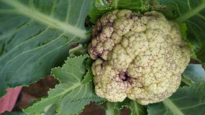 Hi dear Dnyaneshwar Bilari how are you dear as per your image the cauliflower is seem to be infected by cold damage Avoid the kinds of temperature spikes that may cause a crop to change color by planting so that heads mature before summer heats up, or after it cools down.