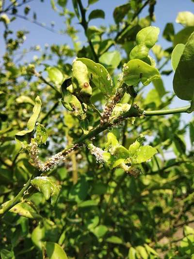 Symptoms Leaf curling upward, Small Urea like white granules all over the leaf as seen in photo, Black eggs beneath the leaf, light brownish orange colour insect sucking the young shoot