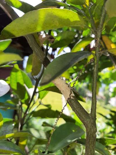 White colored patches on the stem which tortously dries and shed it's leaves. Leaves turn yellow color.
