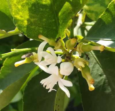 The leaf colour of my lemon plant is developing yellowish patches and are curling. Premature leaf falling has also started. Observed small black colour fly like insects around the flowers as shown in picture. Attack of thrips is also observed. Advise is requested please.