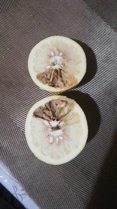 Some fruits are dry and contains no juice, skin has dark color patches on the effected side.