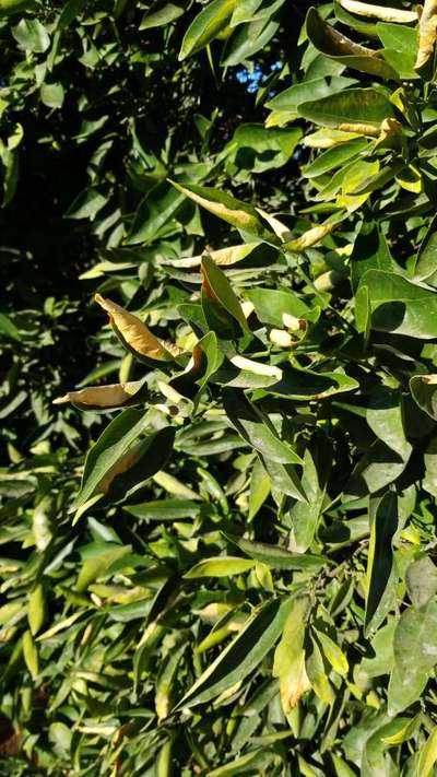 Orange tree leaves curling and brown.