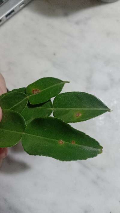 Small visible yellow-brown spots on lower leaves of kaffir seedling.