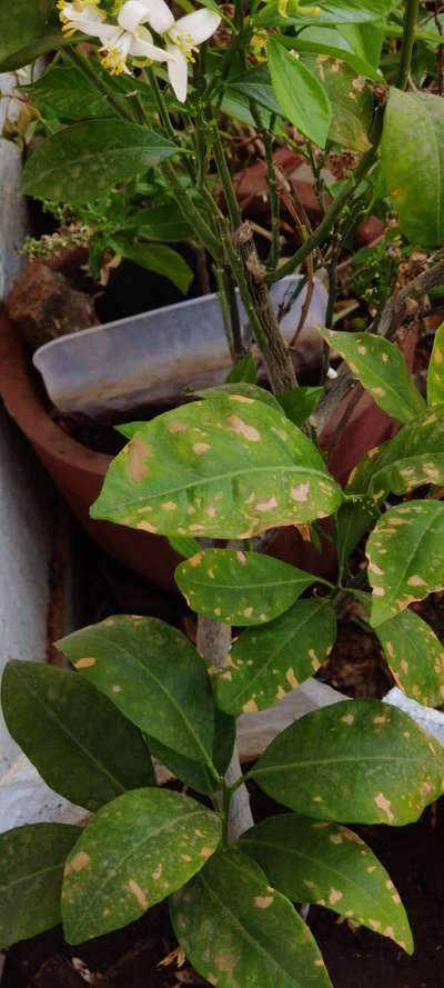 Yellow dry spots and further drying of whole leaf. Doesn't look like fungus. No infestation either. Lost lots of leaves. Lots of flowers but no fruits. Budding n fliwering is happening. But leaves dry off.